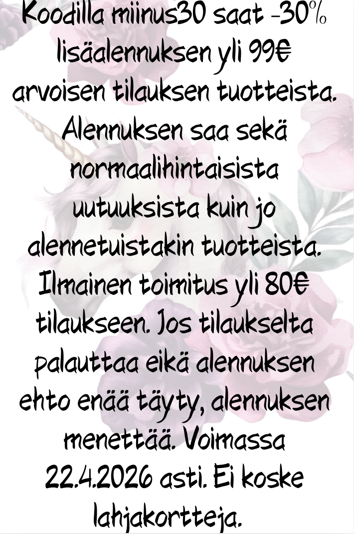 Nopea toimitus Postin pakettina, toimitus 3,90 €/5,90€. Maksuton toimitus yli 80 € tilauksille! Kotipaketti 9,90€.