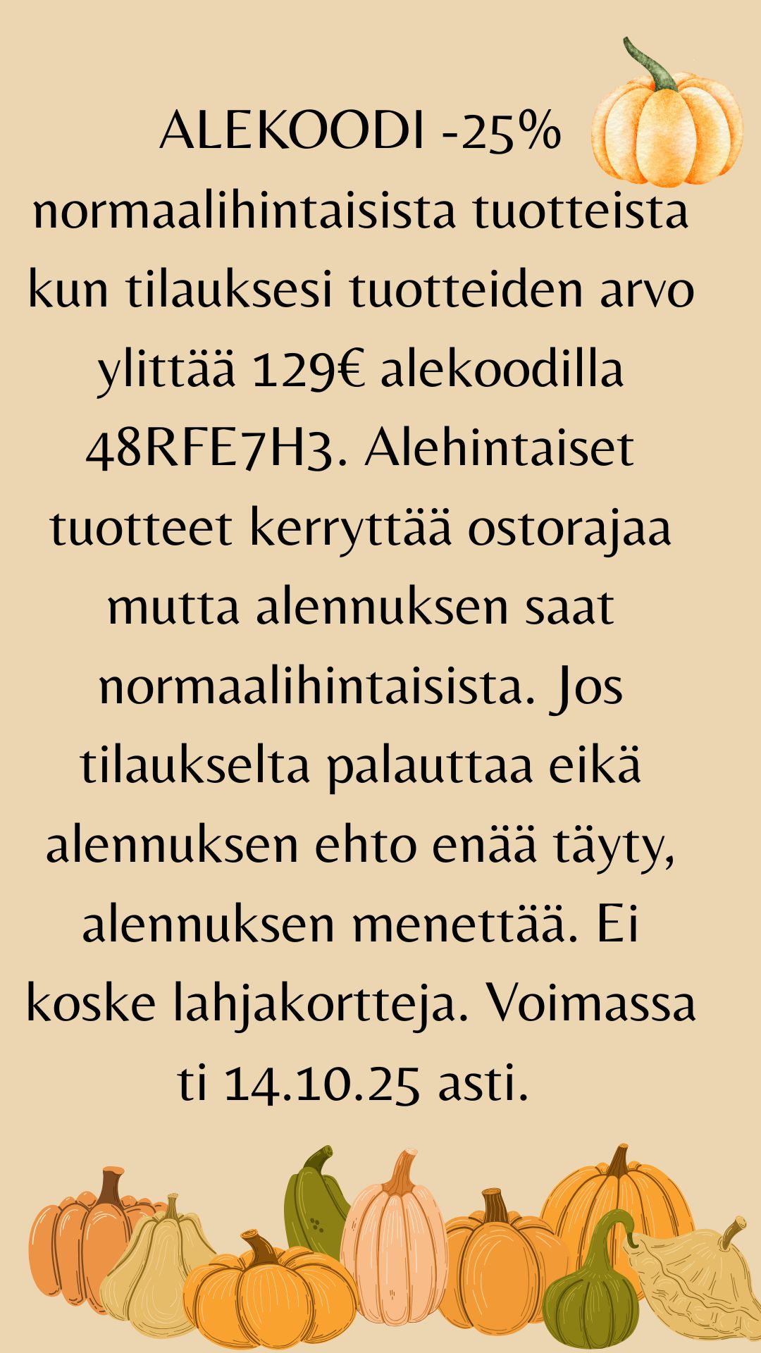 Arkipäivänä tilattu paketti on perillä muutaman päivän sisällä. Pääsääntöisesti arkisin klo 15 mennessä tulleet tilaukset toimitetaan meiltä heti. Kaikki tilaukset toimitetaan seurannalla, noudettavat paketit perillä pääsääntöisesti muutaman arkipäivän sisällä, postin pikkupaketit saattaa kestää hieman pidempään (2-5 arkipäivää). Palautusaika 14 vrk paketin vastaanottamisesta. Ilmainen palautus palauttaessasi osan tilauksesta, koko tilauksen (tai ilmaiseksi toimitetun yli 80€ tilauksen osapalautuksen jäädessä alle 80€) palautuskulu 3,90 € (palautusohjeet löydät käyttöehdoista joka sivun alaosasta).